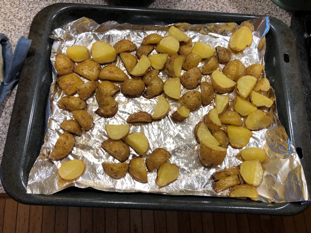 3. Arrange the potatoes in a single layer on the baking sheet and place in the oven.